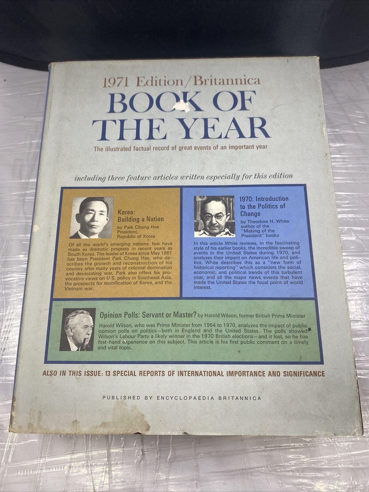 This vintage hardcover edition of the Britannica Book of the Year 1971 is a must-have for any history enthusiast. Printed by Encyclopædia Britannica, Inc., this original edition features a dust jacket and covers a range of historical topics, including the U.S. Census, opinion polls, and graphs. The book is in excellent condition and would make a great addition to any collection.